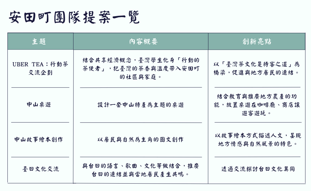 此次活動不僅是臺日學生的短期交流,更是一次深入日本地方社區日常的「沉浸式實踐」。實際走入安田町與黑潮町的田野現場,看見高齡化、防災、人口外移等真實課題。更重要的是,我們並未停留在「觀察」,而是積極「行動」。無論是安田町的「UBER TEA」行動茶席、在地桌遊,或是黑潮町的「社區共享住宿」、「急難救助箱」等提案,都展現了青年世代對於活化地方社區的創意與人文關懷。